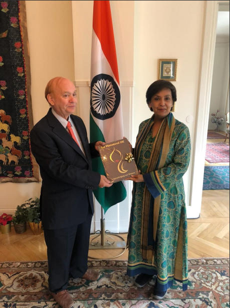 Bilden, nedan, Per lämnar över en bok till Indiens (dåvarande, 2019) ambassadör till Sverige, ambassadörens residens.